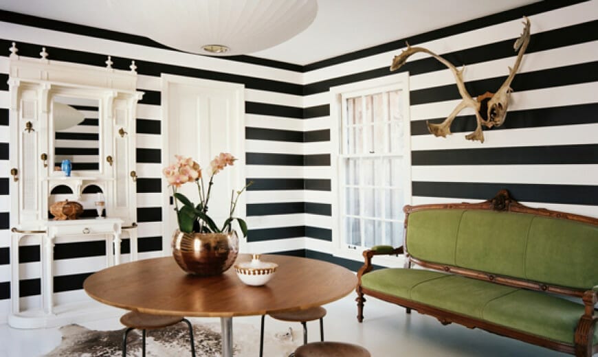 This eclectic living room boasts black and white striped walls. Because of their horizontal orientation, the space seems wider than it is.