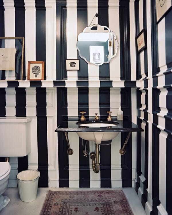 Here, vertical stripes sport white and black. Moreover, they lend the pint-sized powder room an instant graphic punch.