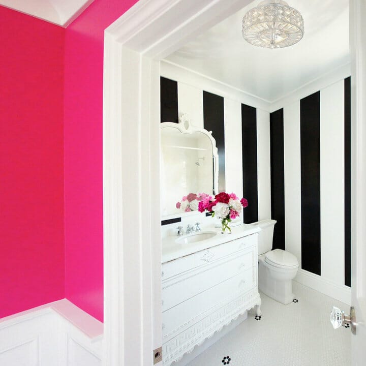 Black and white striped walls are a somewhat common choice for powder rooms. In this case, they make the space more attractive and unique.