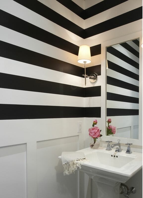 Speaking of black and white striped wall pictures, this one is my favorite. The white and black stripes run in vertical lines. Thanks to them, the powder room’s ceiling appears higher.