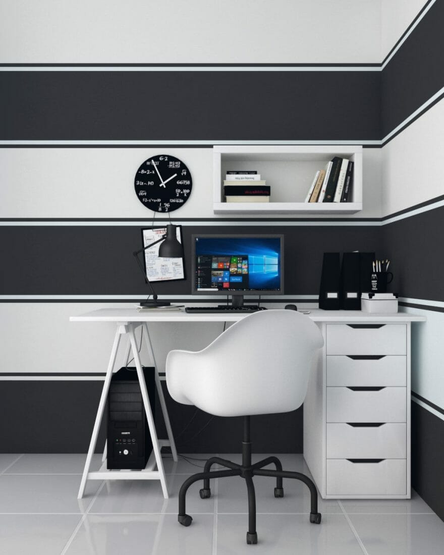 This study room employs a muted black and white striped wall. Furthermore, it steals the spotlight. However, the horizontal stripes do not overpower the area.