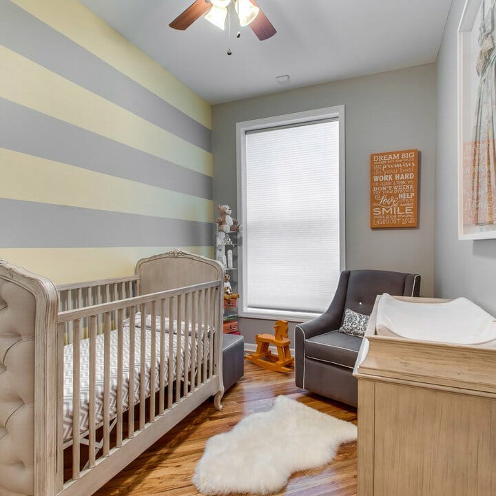 This nursery boasts an accent wall with horizontal stripes that wear pastel grey and creamy-white. Due to them, the room feels calm as well as extra cozy.
