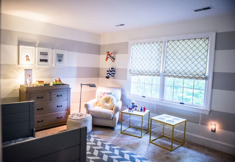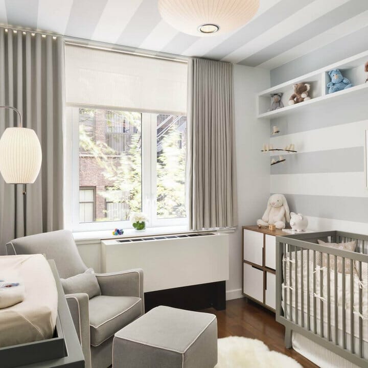 The warm grey stripes blend with the taupe wall while exuding tranquility. Meanwhile, the crisp white ones accompany curtains. In addition, they radiate airiness throughout the nursery.