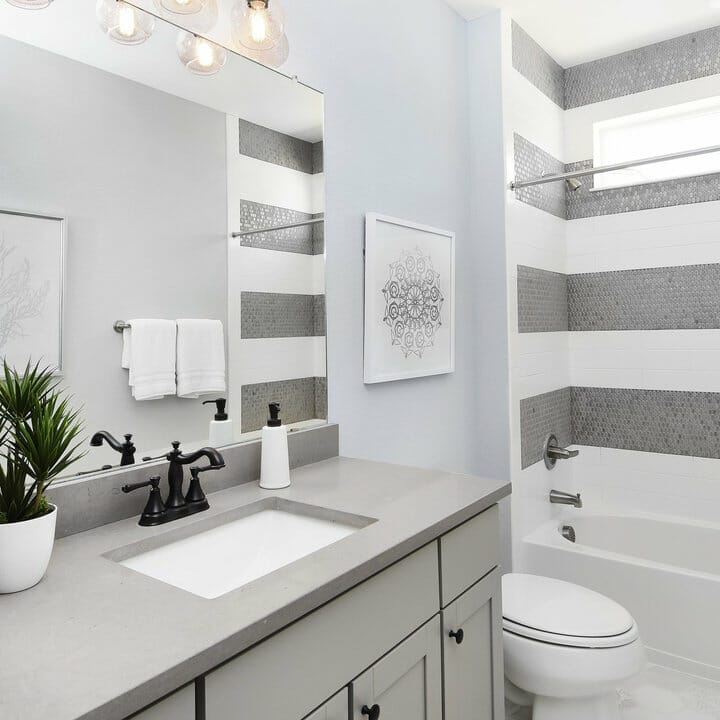 This bathroom sports grey tiles on the walls. Not only do they make outstanding stripes, but also provide visual interest.