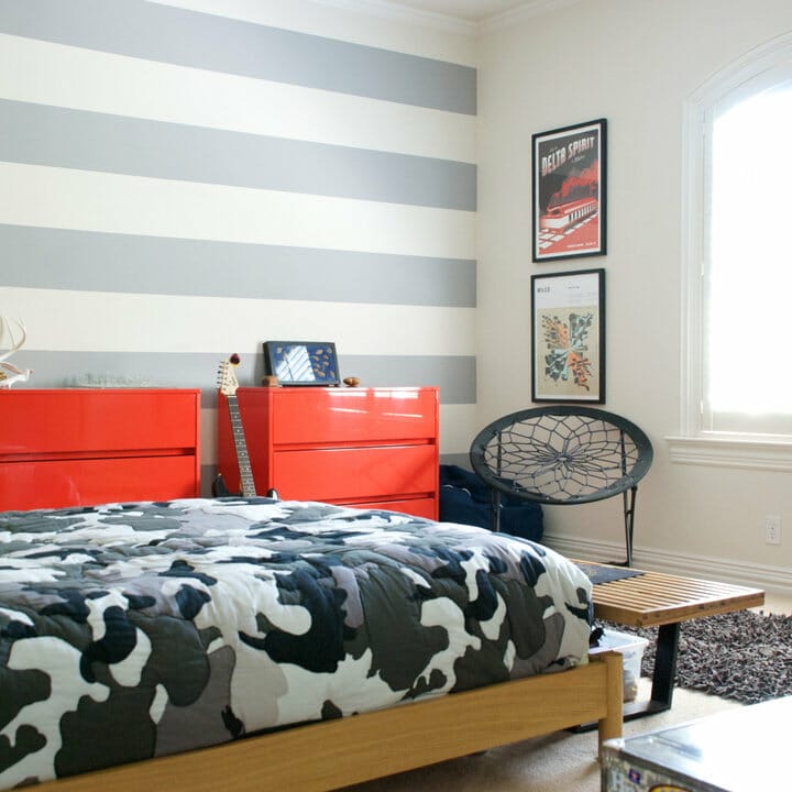 9. Teen Boy’s Bedroom with A Grey Striped Wall