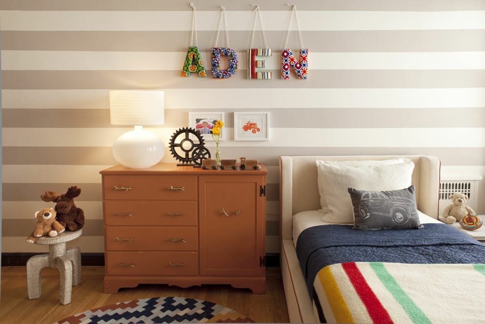 The grey and white striped wall makes the wooden sideboard more visible. Additionally, they lend the teenage boy’s bedroom lots of interest.