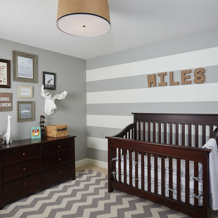 If you aren’t into contrasting stripes, consider trying this option. Here, the nursery boasts striped walls that supply two shades of grey.