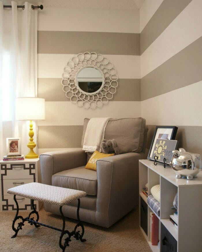 Painting horizontal stripes are a cinch, so why not include them in a nursery? Here, the tiny room doesn’t become cramped due to grey and white striped walls.