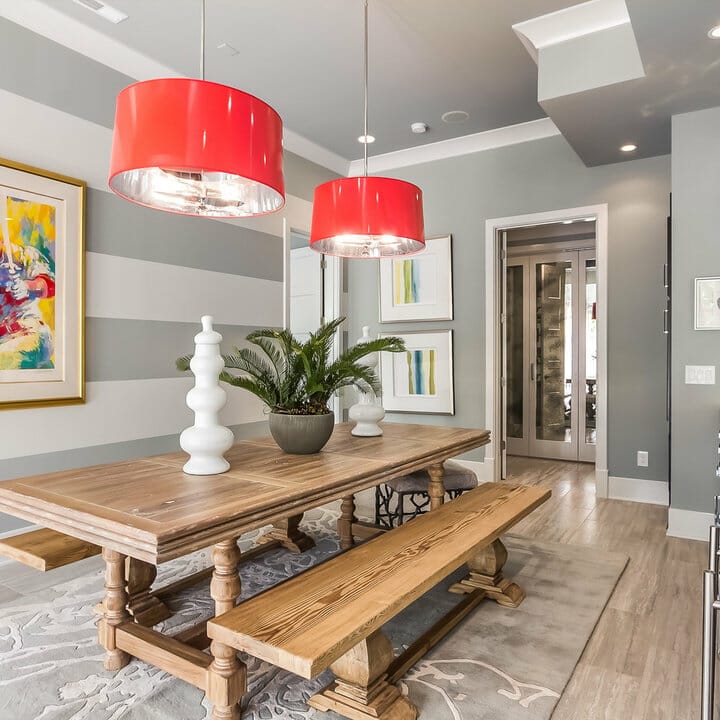 Here, the striped accent wall accentuates the gold- and silver-framed colourful works of art. The bright red pendant lamps contribute to the dining room’s perky look. Moreover, the natural elements inject outdoorsy vibes.