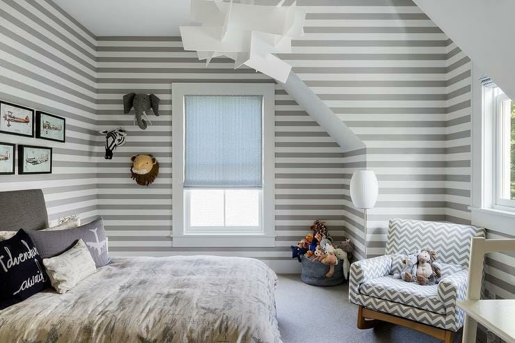 This contemporary child’s bedroom boasts thin grey and white stripes. Moreover, they excellently highlight framed airplane prints as well as adorable felt animal head ornaments.